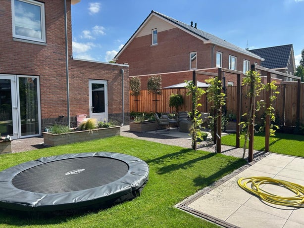 Hier hebben we o.a. het grondwerk gedaan, terrassen aangelegd, pergola's geplaatst en een trampoline ingegraven.