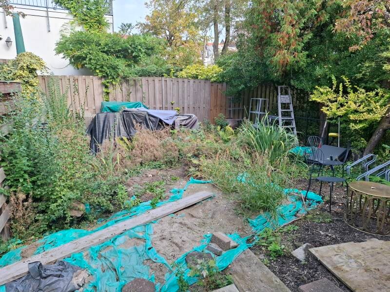 Hier hebben we de complete tuin verwijderd en vernieuwd. Inclusief overkapping, tuinkamer, schuttingen en beschoeiing.