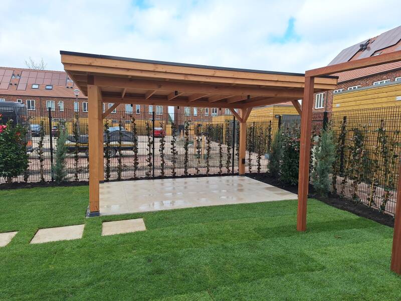 Op de afbeelding is de overkapping 5x4 meter en schuur 4x3 meter.